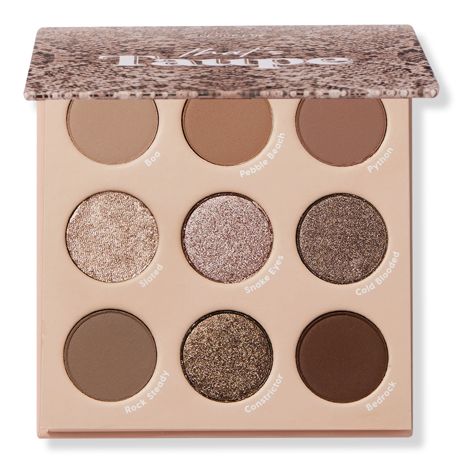 - Middle Row: Slated (ultra-metallic icy taupe with shimmering silver flecks), Snake Eyes (metallic midtone rosey taupe), Cold Blooded (metallic silver taupe)