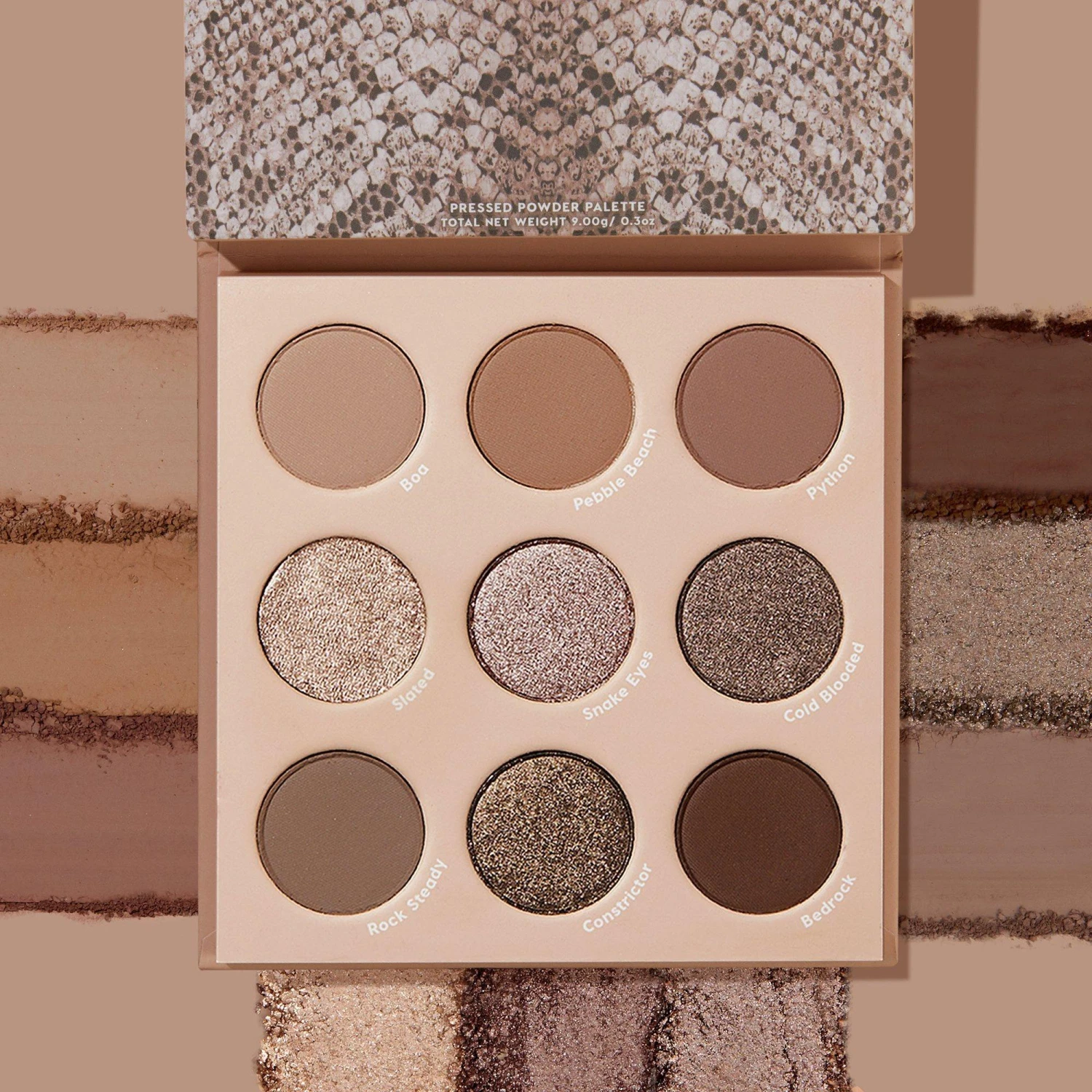 - Bottom Row: Rock Steady (matte deepened taupe), Constrictor (metallic taupe-y bronze cool toned dark brown), Bedrock (matte dark brown)